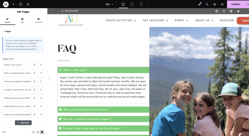 - At this point, FAQ content items can be added, deleted or edited from the toggle items area in the left panel.
